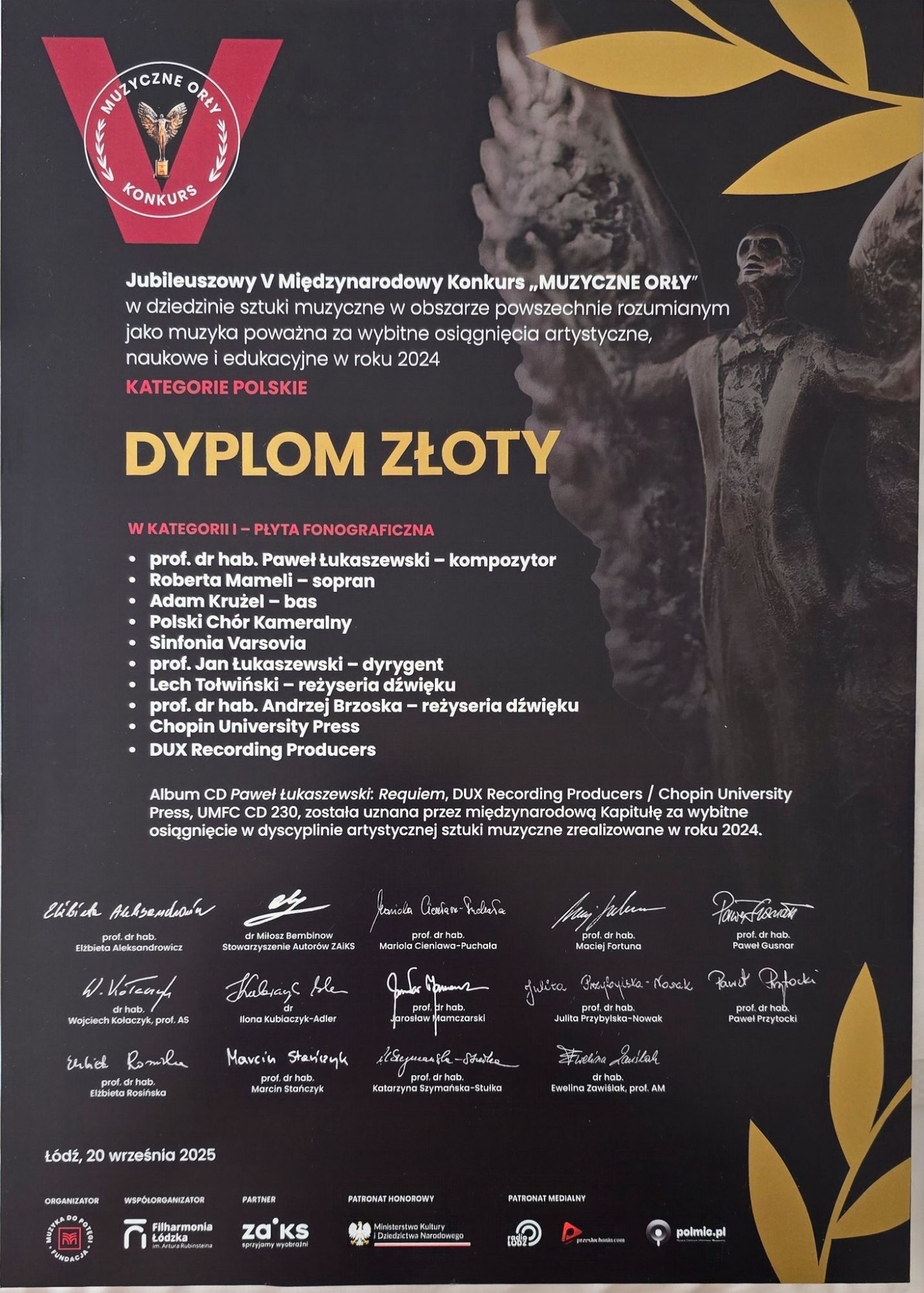 Z radością informujemy, że 7 września 2025 roku Kapituła V edycji prestiżowego Międzynarodowego Konkursu „MUZYCZNE ORŁY” ogłosiła laureatów nagród za wybitne osiągnięcia artystyczne, naukowe i edukacyjne w dziedzinie muzyki poważnej za rok 2024. Uroczysta Gala wręczenia statuetek odbyła się 20 września 2025 roku w gmachu Filharmonii Łódzkiej im. Artura Rubinsteina.